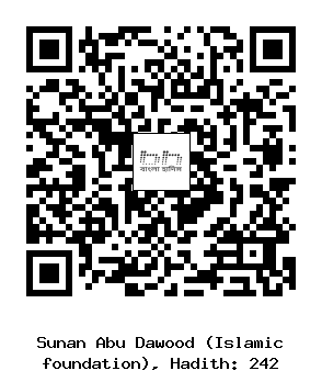 ২৪২. সুলায়মান .... আয়িশা (রাঃ) হতে বর্ণিত। তিনি বলেন, রাসূলুল্লাহ্ সাল্লাল্লাহু আলাইহি ওয়া সাল্লাম অপবিত্রতার গোসলের সময় (সুলায়মানের বর্ণনানুযায়ী) ডান হাত দিয়ে পানি ঢালা শুরু করতেন এবং রাবী মুসাদ্দাদের বর্ণনা মতে, তিনি (সাল্লাল্লাহু আলাইহি ওয়াসাল্লাম) উভয় হাত ধৌত করার পর ডান হাতে পানি ঢালতেন। অতঃপর উভয় রাবী এই পর্যায়ে ঐক্যমত পোষণ করেন যে, অতঃপর তিনি স্বীয় লজ্জাস্থান ধৌত করতেন। রাবী মুসাদ্দাদ বলেন, (ডান হাতের পর) বাম হাতে পানি ঢালতেন, কখনও কখনও আয়িশা (রাঃ) সরাসরিفرج (পুরুষাংগ) শব্দ ব্যবহার না করে তদস্থলে অন্য শব্দ ব্যবহার করতেন। অতঃপর নামাযের উযূর ন্যায় উযূ (ওজু/অজু/অযু) করতেন। তিনি উভয় হাত পাত্রের মধ্যে প্রবেশ করিয়ে পানি নিতেন এবং শরীরের লোমকূপ (চুল) মর্দন করতেন। এভাবে যখন তিনি দেখতেন যে, সর্বাংগে পানি পৌছেছে অথবা সমস্ত শরীর পবিত্র হয়েছে- তখন তিনি মাথায় তিনবার পানি ঢালতেন। অতঃপর পানি অবশিষ্ট থাকলে তা মাথায় ঢালতেন। (বুখারী, মুসলিম, তিরমিযী, ইবনু মাজাহ)