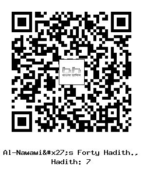 ৭। আবূ রুকাইয়্যা তামীম ইবনু আওস আদ্-দারী রাদিয়াল্লাহু ’আনহু হতে বর্ণিত হয়েছে- নবী সাল্লাল্লাহু ’আলাইহি ওয়াসাল্লাম বলেছেন: দ্বীন হচ্ছে শুভকামনা। আমরা জিজ্ঞেস করলাম: কার জন্য? তিনি বললেন: আল্লাহ্, তাঁর কিতাবের, তাঁর রাসূলের, মুসলিম নেতাদের এবং সকল মুসলিমের জন্য।