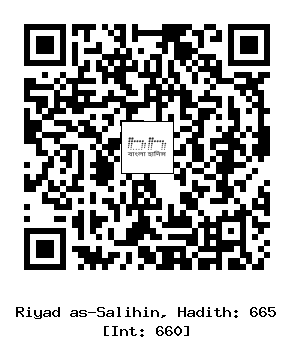 ২/৬৬৫। ’আব্দুল্লাহ ইবনে ’আমর ইবনুল ’আস (রাযিয়াল্লাহু আনহুমা) বলেন, রাসূলুল্লাহ সাল্লাল্লাহু আলাইহি ওয়াসাল্লাম বলেছেনঃ নিশ্চয় ন্যায় বিচারকরা আল্লাহর নিকট জ্যোতির মিম্বরের উপর অবস্থান করবে। যারা তাদের বিচারে এবং তাদের গৃহবাসীদের মধ্যে ও যে সমস্ত কাজে তারা দায়িত্বপ্রাপ্ত হয়েছে, তাতে তারা ইনসাফ করে’’ (মুসলিম) [1]