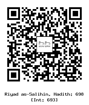 ১/৬৯৮। আদী ইবনে হাতেম রাদিয়াল্লাহু ’আনহু বলেন, আল্লাহর রাসূল সাল্লাল্লাহু আলাইহি ওয়াসাল্লাম বলেছেন, যদি আধখানা খেজুর দান করে জাহান্নামের আগুন থেকে বাঁচতে পার তবুও বাঁচ। যদি কোন ব্যক্তি এটাও না পায়, তাহলে সে যেন ভাল কথা বলে বাঁচে। (বুখারী ও মুসলিম) [1]