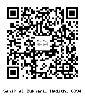 ৬৯৯৪. আনাস (রাঃ) হতে বর্ণিত। তিনি বলেন, রাসূলুল্লাহ সাল্লাল্লাহু আলাইহি ওয়াসাল্লাম বলেছেনঃ যে আমাকে ঘুমন্ত অবস্থায় দেখল সে আমাকেই দেখল। কারণ শয়তান আমার আকৃতি ধরতে পারে না। আর মু’মিনের স্বপ্ন নবুয়তের ছেচল্লিশ ভাগের এক ভাগ। [৬৯৮৩; মুসলিম পর্ব ৪২/হাঃ ২২৬৪, আহমাদ ১২০৩৭] (আধুনিক প্রকাশনী- ৬৫১০, ইসলামিক ফাউন্ডেশন- ৬৫২৩)