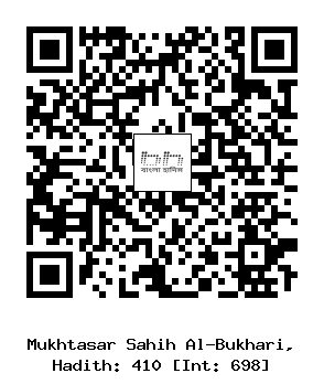 ৪১০) আব্দুল্লাহ ইবনে আব্বাস (রাঃ) হতে তাঁর খালা মাইমুনার ঘরে রাত্রি যাপনের হাদীছটি পূর্বে অতিক্রান্ত হয়েছে। এখানে এতটুকু অতিরিক্ত বর্ণিত হয়েছে যে অতঃপর তিনি এমন গভীর নিদ্রামগ্ন হলেন যে তাঁর নাক ডাকার আওয়াজ শুনা গেল। নবী সাল্লাল্লাহু আলাইহি ওয়া সাল্লাম যখন ঘুমাতেন তখন তাঁর নাক থেকে আওয়াজ বের হত। অতঃপর তাঁর কাছে মুআয্যিন আগমণ করলেন। তিনি মসজিদে গিয়ে নামায পড়লেন কিন্তু অযু করলেন না।